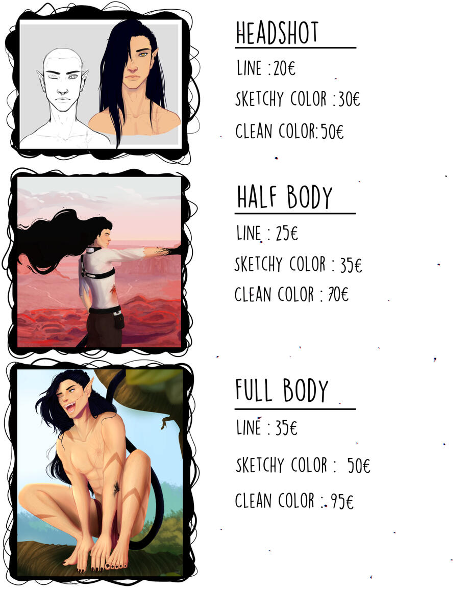 → After what you want is clear and we both agree on the price, I'll send you an invoice and a sketch. (You can ask up to 3 free modifications)→ Then, start the process of creating, I'll send you WIPs if you want so you can see where it's going :)→ If the total price is above 100€, you can pay in multiple times (not more than 3 times). I'll finish the drawing only when the final payment is made.By comissionning me, you agree with all the terms listed above !